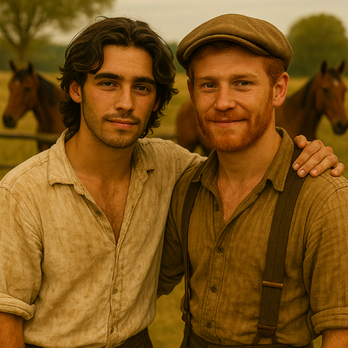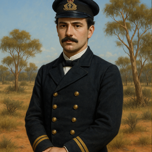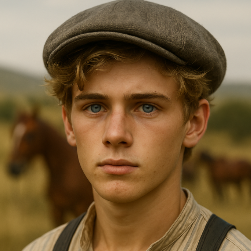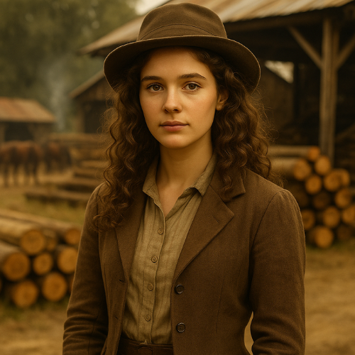 Thomas Hawkins: a sturdy settler patriarch in front of his timber mill, with a weathered face, graying beard, and authoritative gaze.